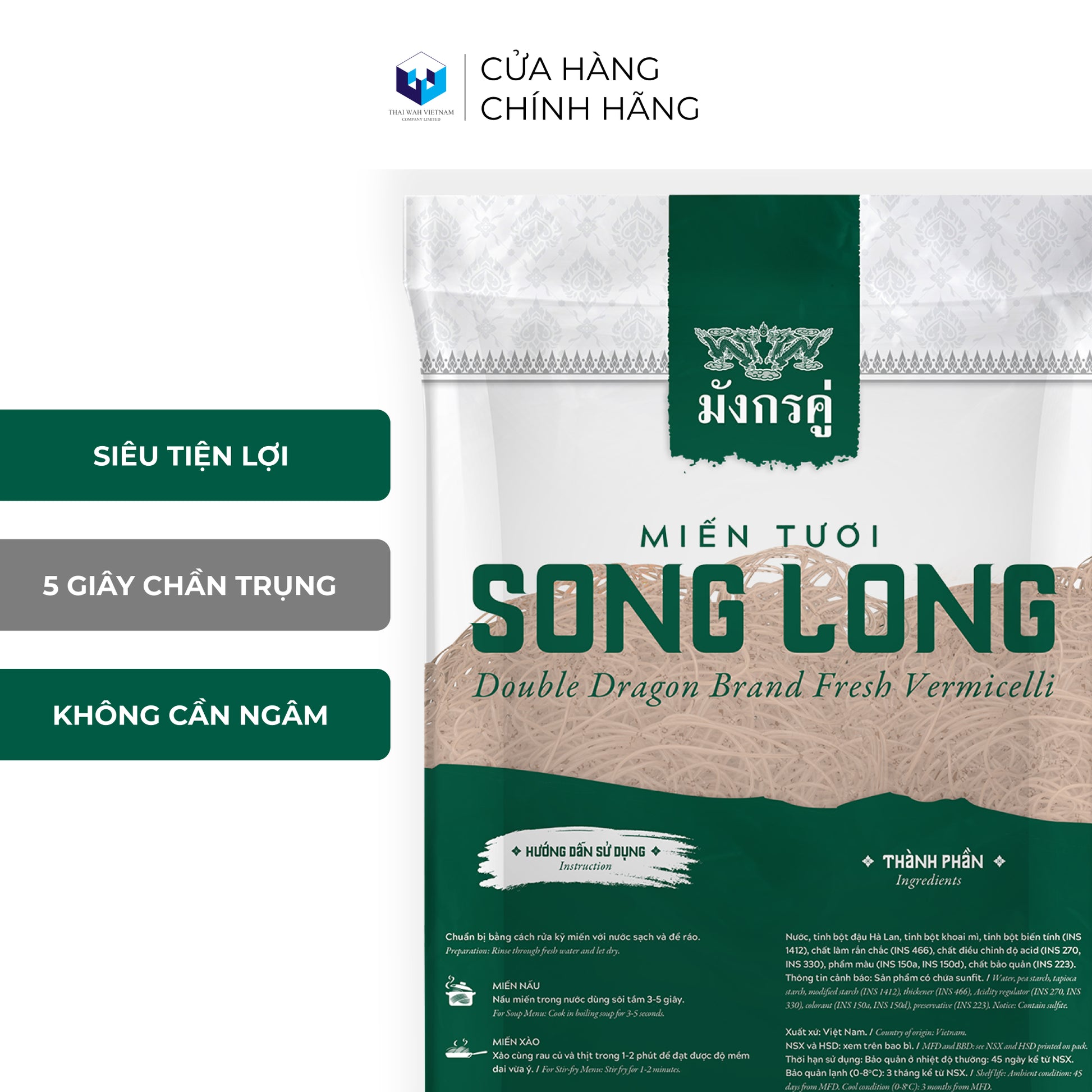Sản phẩm cho những người nội trợ hiện đại trong cuộc sống bận rộn hiện nay. Chỉ 5 giây chần trụng là sẵn sàng chế biến cùng các món xào, trộn, lẩu… miến tươi Song Long mang lại sự tiện lợi bất ngờ cho việc làm bếp.